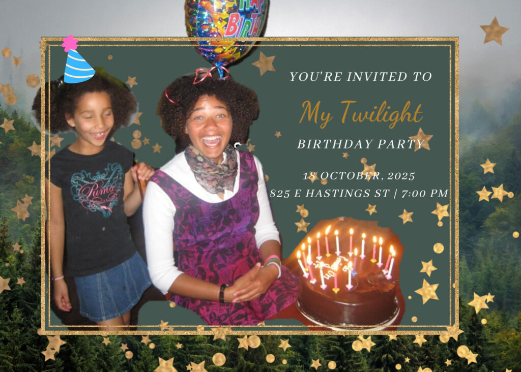Springing forth during the crepuscular of last century, Kyra was raised on new moon girl magazine. Now an ambitious perfectionist with multiple degrees, Kyra isn’t troubled by the sisterly eclipse. Nor is Sierra, born almost exactly 10 years to the day to Kyra. After leaving the colony behind to break dawn in the heart of the Empire, the carefree baby is enjoying her time and her life far far away. Sierra has decided to come visit home… just in time for her birthday. The whole family will be there, so please join us for a TWILIGHT celebration!