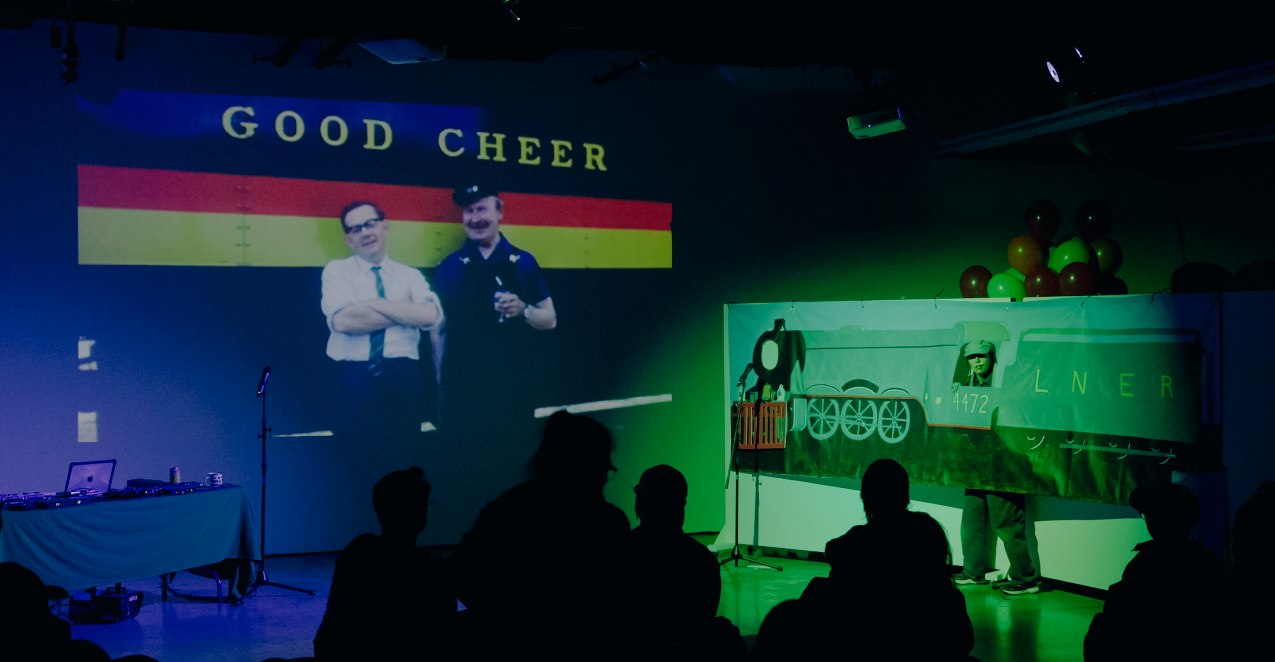 In front of a seated audience, Arnold used a table of A/V equipment to set the scene, dimming the lights before slipping behind a large hand painted cut-out of the Flying Scotsman. As narration about the train and Pegler’s first meeting played in the background, Arnold brought the Scotsman to life through a merging of historical chronicling and theatrical humor.
