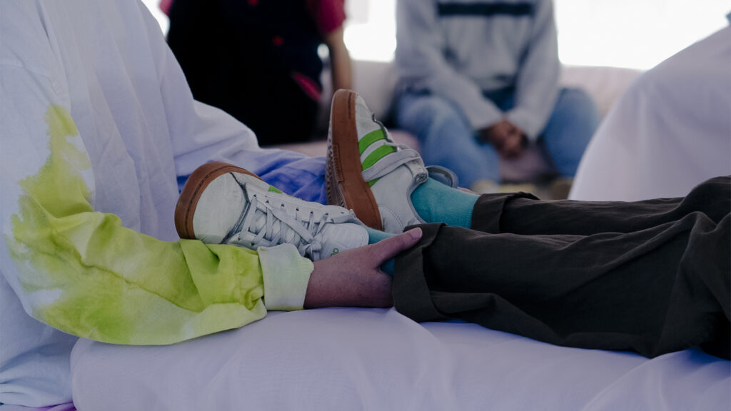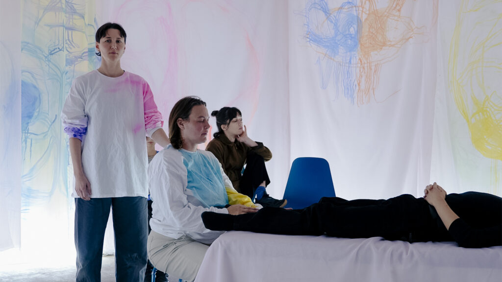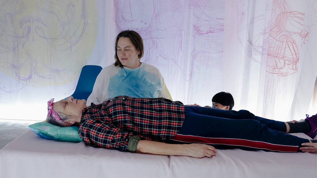 Dreaming the Asklepion is an interdisciplinary performance and installation project that reimagines ancient healing spaces as contemporary, immersive environments for collective transformation. It is a collaborative work by visual artist Zoë Kreye, dance artist and craniosacral therapist Alexa Solveig Mardon, and visual artist and craniosacral therapist Lisa Prentice whose combined practice includes developing rituals for transmuting embodied and spiritual experiences into the creation of sculpture, painting, and movement. Dreaming the Asklepion draws inspiration from ancient Greek Asklepions—holistic healing centers that integrated ritual, aesthetics, and embodied experience as tools for personal and societal restoration. During this performance audiences are invited to co-create the work by moving between the roles of witness and participant. During the performance sessions participants are given the opportunity to receive moments of bodywork from the performers: gentle hands-on contact akin to cranial touch which could include light contact with one’s heels, hands, arms, knees, head, neck or belly. Physical contact during the performance is always optional and negotiated verbally with the performers. Thinking through the ways architecture, sensory design and artistic setting can be used as therapeutic tools in their own right, the artists ask: what would a contemporary Asklepion look like? Perhaps, one where intuition, sensation, and art are central to collective healing.