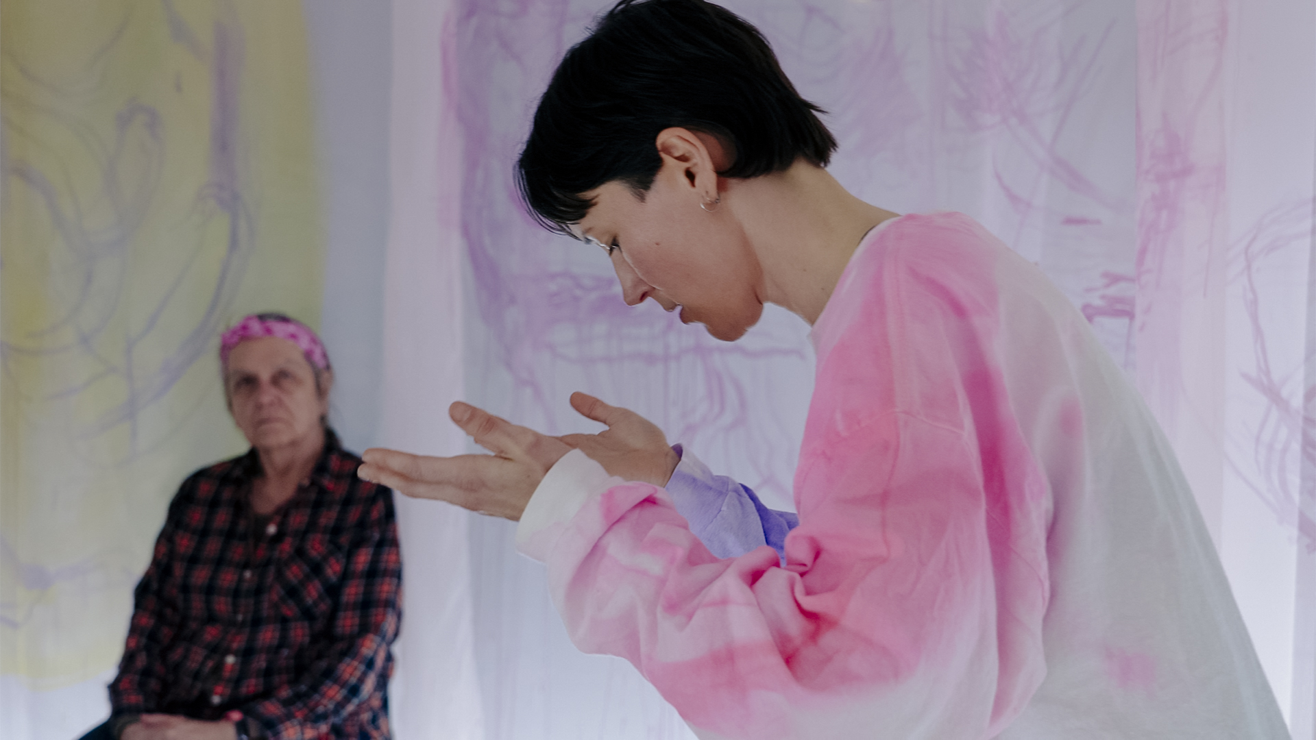 Dreaming the Asklepion began with an invitation to slow down and ground before entering the installation. As the audience entered and walked around they were encircled by a series of Zoë Kreye’s translucent gestural paintings in pinks, blues, yellows, and oranges on white chiffon fabric which were hanging like curtains from the ceiling. People oriented themselves by moving through the space; touching, sensing and exploring with child-like curiosity. To begin, Zoë Kreye, Alexa Solveig Mardon, and Lisa Prentice, accompanied by Luciana Freire D’Anunciação and Erika Mitsuhashi, took turns guiding the group and situating the work. People were invited to sit in chairs and cushions around the space as the performers explained the historical role of Asklepions in ancient Greece as sacred sanctuaries designed to promote healing through full-spectrum engagement which included physical movement, artistic experience, nutrition, community gathering, and sleep. After an announcement that “the Asklepion is now open,” the piece shifted and audience members were invited to participate in receiving touch. Those who chose to could lie down at a prepared station, made up of soft supports and layers of beautifully draped fabrics, and have a dialogue with one of the performers about where on their body they would like to receive support. The performer then placed their hands lightly on a specific part of the body, like a support under a knee or a hand on a shoulder, as the work continued. While the performers positioned at one of the three working stations focused on the participant in front of them, the other performers moved throughout the space in a series of hybrid dance-like scores, sometimes in silence, other times uttering streams of dream-speak. As in ancient Greek Asklepions where dreams were considered essential to diagnosis and healing, in this contemporary Asklepion dream narratives were woven into the performance as therapeutic tools. Cycles of participation and observation continued with some audience members resting in stillness while others were guided by their desire to explore the tactility of the clay or move around the space. When it was time to close the performers offered a similar invitation to ground, then, after a moment to breathe, the session came to an end. “The Asklepion is closed, for now.”
