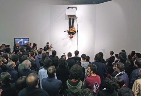 William Hunt’s The Impotence of Radicalism In the Face of All These Extreme Positions (2005), features the artist performing a self-composed acoustic rock song while suspended upside down. Hoisting himself to the